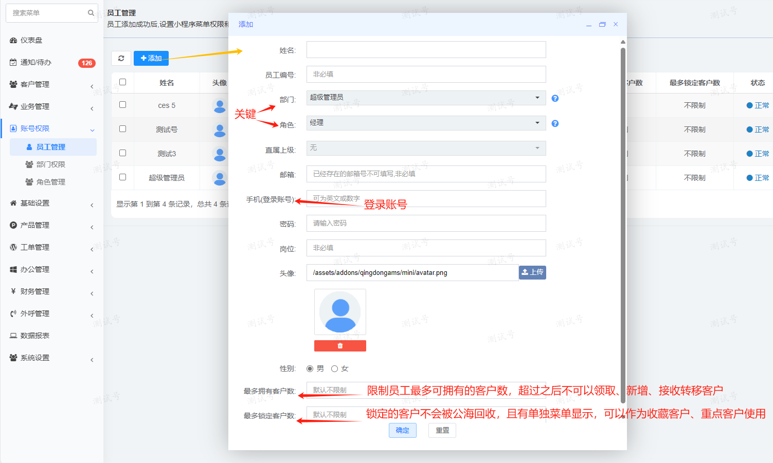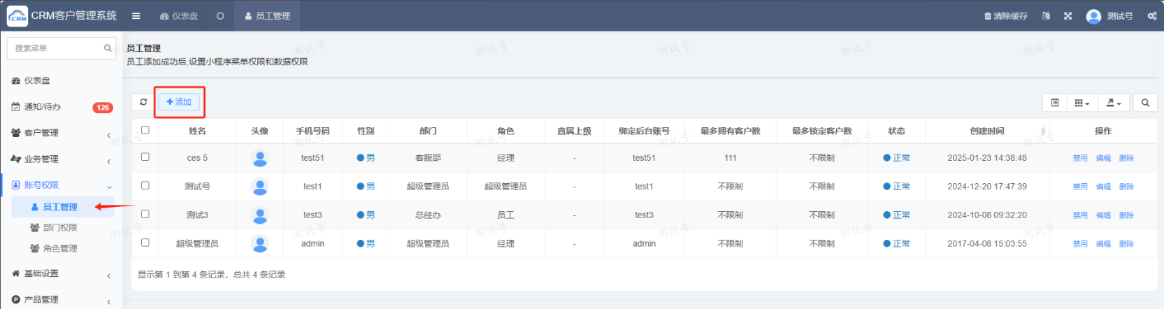 #### 一、位置:账号权限>>员工管理>>添加  --- #### 二、填写员工信息 1. 账号选择不同【部门】,决定不同操作权限。权限设置在【账号权限】--【部门权限】中。[设置部门方法](https://doc.vmcrm.cn/knowbase/document/316.html "点击跳转") 2. 账号选择不同【角色】,控制不同数据查看权限,在【账号权限】--【角色管理】中设置权限。 (可设置[本人]、[本人及下属]、[本部门]、[本部门及下属部门]、[全部]) > ##### 注意:登录账号是手机号(可以是数字或者字母)  ---